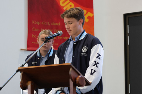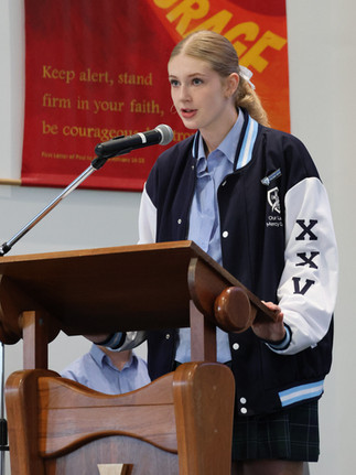College Captains Olivia and Daniel delivered a powerful address, reflecting on the enduring legacy of Anzac Day. Olivia, speaking from the perspective of a 17-year-old, shared her respect for the young ANZAC soldiers at Gallipoli and highlighted the values they lived by — courage, honour, endurance, initiative, discipline, and mateship — values that continue to shape our national identity.